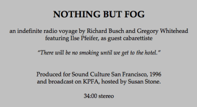 A radio navigation commissioned by Sound Culture 1996 in San Francisco, with radio works curated by Susan Stone. Produced in close collaboration with Richard Busch, with inspiration from his exquisite Drei Nebel Lieder.