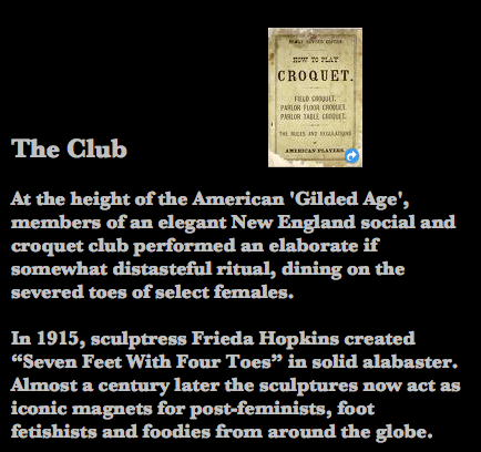 A play in the form of a documentary interpreting the trace vibrations of a Gilded Age headache that began in the feet. Created for the BBC in 2005, and broadcast on the New Year of 2006, at the apex of the more recent Gilded Age: