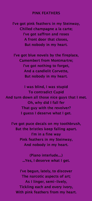 Featuring brilliant music by Richard Busch, who also contributed lyrics for the Club’s theme song: I’ve got pink feathers in my Steinway, and nobody in my heart.