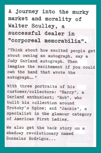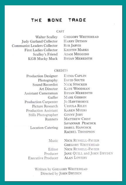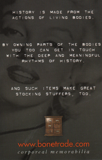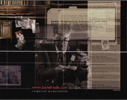 Sculley’s market for corporeal memorabilia first emerged as part of a BBC radio “conversations with possible people” series Talk to Sleep, produced in collaboration with Goldhawk; then was made into a short film, directed by John Dryden; generated a website, which functioned for a number of years; subsequently published as a dialogue in Cabinet, with an update to follow; and finally, featured as a mixed media installation at Mass Moca, including a series of photomontages by Harry Willis Fleming, who also designed the website and has been a key bone trade affiliate since early days, together with Jane Wildgoose of the Wildgoose Memorial Library.
