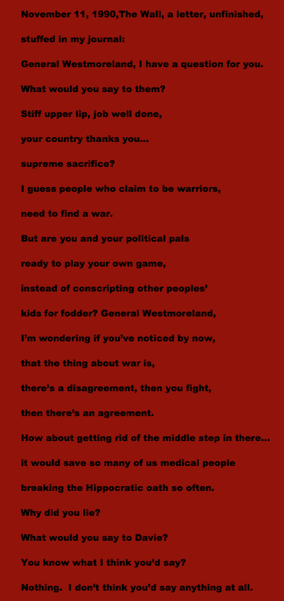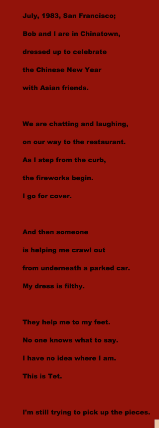 An adaptation for BBC radio 4 of a stage play by Normi Noel, itself based on poems, letters and conversations with former Vietnam field nurse, Penny Rock.