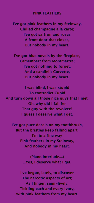 Featuring brilliant music by Richard Busch, who also contributed lyrics for the Club’s theme song: I’ve got pink feathers in my Steinway, and nobody in my heart.
