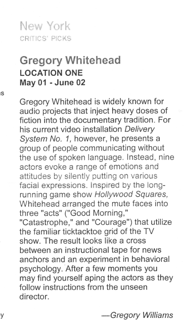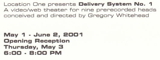 Assisting on the project were Heather Wagner and François Bucher, who also produced a short video documenting the process, whereby the nine actors responded to audio tape instructions, each in their own style, with additional direction from me: the nine heads in synchrony comprise the Delivery System. Hollywood Squares, following the pulse of The Catastrophe.