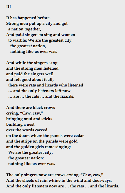 It is still mainly the mysteries that enthrall me, too, and I still believe in the poetic vitality of edges, which is where the mysteries reside. Edges between eros and thanatos, seduction and oblivion, order and chaos; between sense and nonsense, facts and fables, the living and the dead; between the lover’s whisper and the warrior’s scream. Friction among all these edges still creates ample energy to float my canoe among the beaver lodges.